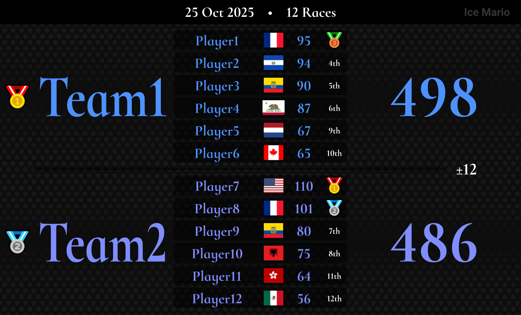- races: force display the race count (ex. 12 Races) if the score is divisible by 39 or 82. Use this option if you are creating a tournament table, like mku, that does not show the race count by default.
