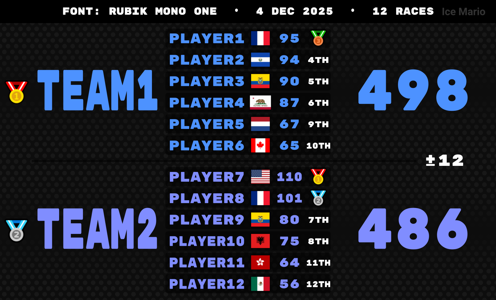 light: Light mode. The background uses the clan's color with black text.mkt: Add the MKT logo in the middle of the table.cycloneandswwill automatically add it, unless you specifynomktnomkt: Don't add the mkt logo. This option can be used to force the table maker to not add the MKT logo.allbold: Make all the text bold.bold: Make only the player names and player scores bold. Kept for backwards compatability since allbold was added.nobold: Force all the text to not be bold.nodate: Hide the date. However, this will not be available if you are creating a tournament table.races: Force display the race count (ex. 12 Races) if the score is divisible by 39 or 82. Use this option if you are creating a tournament table, like mku, that does not show the race count by default.noraces: Hide the race count.noline: Hide the line separating the different teams. Useful if you are using a background image.bgfit: Forces the full background image to fit within the table. By default, without bgfit, the background will be scaled to fill the entire table. See example 7 and example 8 below to see what the background star looks like with and withoutbgfit.norank: Disable the rank icons for the teams and players. For example, the table will display1stinstead of 🥇.nologofontsornlf: Do not load fonts attached to logos from/logo add-or-edit